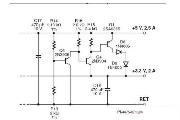 5V輸出端與3.3V輸出端的標準差異為1.7V。當負載要求從3.3V輸出端獲得額外的電流,而從5V輸出端輸出的負載電流並未等量增加時,其輸出電壓與3.3V輸出端的電壓相比將會升高。由於電壓差異約超過100 mV,Q5將偏置截止,從而導通Q4和Q1並允許電流從5V輸出端流到3.3V輸出端。該電流將降低5V輸出端的電壓,進而縮小兩個輸出端之間的電壓差異。