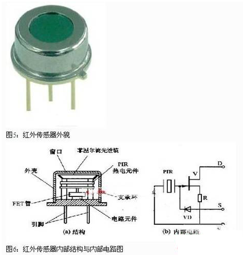 被動式紅外傳感器有三個關鍵性的元件:菲涅爾濾光透鏡,熱釋電紅外傳感器(PIR)和匹配低噪放大器。菲涅爾透鏡有兩個作用:一是聚焦作用,即將熱釋紅外信號折射在PIR上:二是將探測區內分為若幹個明區和暗區,使進入探測區的移動物體(人)能以溫度變化的形式在PIR上產生變化的熱釋紅外信號。一般還會匹配低噪放大器,當探測器上的環境溫度上升,尤其是接近人體正常體溫(37℃)時,傳感器的靈敏度下降,經由它對增益進行補償,增加其靈敏度。輸出信號可用來驅動電子開關,實現LED照明電路的開關控製。圖5是紅外傳感器外貌,圖6 是紅外傳感器內部結構與內部電路圖。圖7 是帶紅外傳感器的LED照明燈具,這是一款E27標準螺口燈頭的燈具,它的電源適用範圍是 AC180V-250V (50/60Hz), 紅外傳感器檢測範圍大約在3M—15M,它的標準產品 IFS-Bulb 3W燈具達80 lm ,5W燈具達140 lm 。在LED光源模塊的中央部分嵌入紅外線傳感器。一旦紅外傳感器檢測到人的體溫,LED電燈泡將會在50秒內自動開啟與關閉。適用於任何一種室內應用,如走廊、儲藏室、樓梯和大廳入口處。