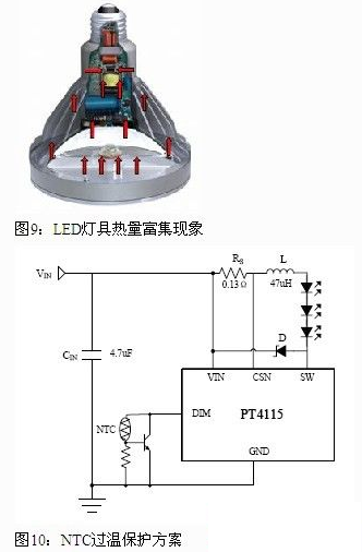 溫度傳感器NTC做LED燈具的過溫保護被比較早的廣泛應用。LED燈具如采用大功率LED光源,就必須采用多翼的鋁散熱器,由於室內照明用的LED燈具本身空間很小,散熱問題到目前還是最大的技術瓶頸之一。LED燈具散熱不爽的話,會導致LED光源因過熱而早期光衰。LED燈具開啟後熱量還會因熱空氣自動上升而向燈頭富集,影響電源的壽命(圖9)。因此在設計LED燈具時可以在鋁散熱器靠近LED光源方緊貼一個NTC,以便實時采集燈具的溫度,當燈杯鋁散熱器溫度升高時可利用此電路自動降低恒流源輸出電流,使燈具降溫;當燈杯鋁散熱器溫度升高到限用設定值時自動關斷LED電源,實現燈具過溫保護,當溫度降低後,自動再將燈開啟(圖10)。[page]