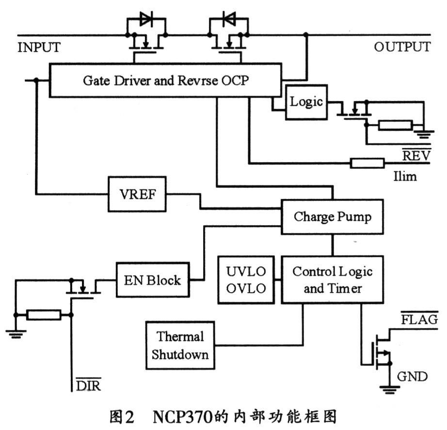 將外設連到IN端,NCP370便可進入反向模式。此時,外設內部的電池可由NCP370的OUT端來供電。在反向模式下,NCP370的REV端必須置低,這樣,當外設發生過壓、欠壓或過流等故障時,NCP370內部的過壓、欠壓或過流保護電路才會起作用,同時其FLAG也才會向係統發出報警信號。圖2所示是NCP370的內部功能框圖。