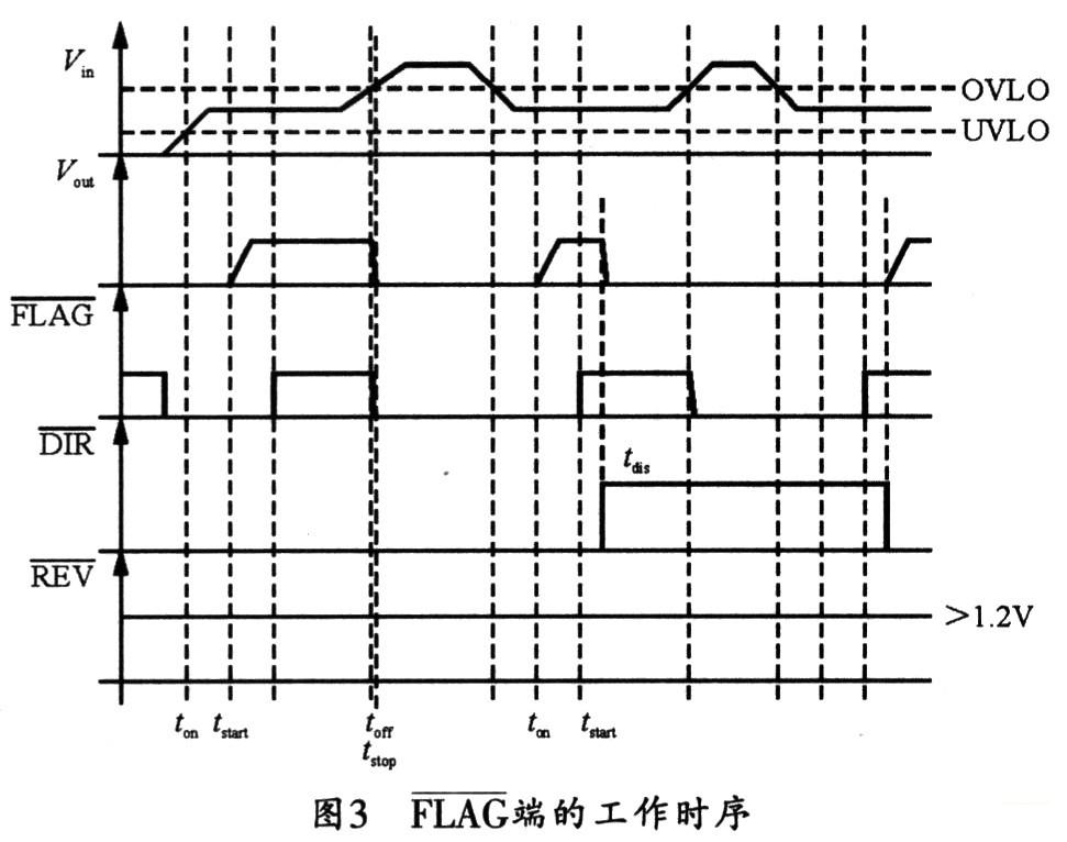 NCP370內含一個FLAG報警提示引腳。一旦NCP370檢測到輸入電壓高於OVLO閥值、低於U-VLO閥值或過流、過壓等故障,FLAG端就會置低,並通知微控製器采取適當的措施。而當輸入電壓恢複到正常範圍時,FIAG又會在經過一個延遲後置高,隨後使Vout恢複輸出,其工作時序如圖3所示。
