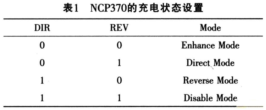 將NCP370的DIR端強製拉低,並將DEV端拉高,NCP370即可進入正向充電狀態。而將DIR端置高時,OUT端會與IN端斷開,具體的充電狀態設置如表1所列。另外,DIR也會受到OVLO或U-VLO故障的影響(FLAG有效)。