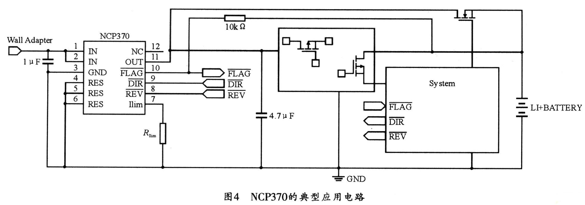 DIR:正向模式輸入端,需與REV結合起來使用。當牆上適配器AC-DC連接到IN端時,NCP370內部的N溝道MOS管開啟,電路進入正向模式。而當該端和REV均為高時,NCP370進入關斷模式,此時,輸出將與輸入斷開。但DIR端的狀態不會影響到FLAG的故障檢測。