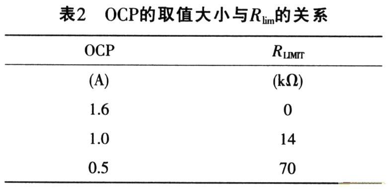 當外設電阻Rlim上的電流(Ilim)高於Iocp時,流過其內部N溝道MOS管的電流就會受到限製,這樣,NCP370就能提供從電池到外設的反向過流保護功能。由於NCP370的內部電阻與Ilim是串聯關係,因此,當Ilim引腳直接與GND相連時,其OCP最大,而在它們之間接入Rlim時,其OCP會減小,OCP的取值大小如表2所列。當電流高於OCP時,其內部的NMOS會關斷,且/FIAG會置低,同時NCP370會通知微控製器來對故障進行處理,並禁止反向充電模式。