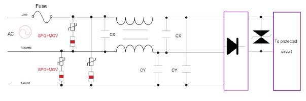 9、專用於高頻通訊信號線路進行防護,一般不能直接用在有源電路上進行防護,在有源線路中它必須配合限壓型(MOV、HYPERFIX)的保護器件來同時使用。