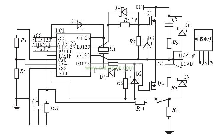圖2中HIN1~HIN3、LIN1~LIN3:逆變器上橋臂和下橋臂功率管的驅動信號輸入端,低電平有效。CA-、CAO、VSO:內部放大器的反相端、輸出端和同相端,可對主電路的電流進行檢測。ITRIP:過流信號檢測輸入端,可通過輸入電流信號來完成過流或直通保護。FAULT:過流、直通短路、過壓、欠壓保護輸出端,該端提供一個故障保護的指示信號。它在芯片內部是漏極開路輸出端,低電平有效。VB1~VB3:是懸浮電源連接端,通過自舉電容和快速恢複二極管為3個上橋臂功率管的驅動器提供內部懸浮電源,其中快速恢複二極管的作用是防止母線電壓倒流損壞器件,VS1~VS3是其對應的懸浮電源地端。HO1~HO3、LO1~LO3:逆變器上下橋臂功率開關器件驅動器信號輸出端。
