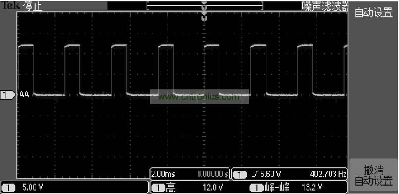 在實際應用中柵極的驅動波形如圖4所示,此波形是在電機3000RPM時的驅動波形,可以看出此波形完全能夠滿足要求,同時進行了短路、電機堵轉等試驗,圖3電路也能過很好地保護功率MOSFET管。