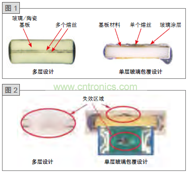 圖1比較了SFF保險絲的多層設計與標準玻璃包覆設計。當熔絲斷開時,玻璃包覆設計僅依靠熔絲一側上的塗層吸收汽化熔絲材