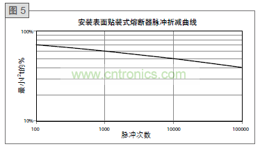 一旦確定了應用波形的I2t值(zhi),它(ta)必(bi)須(xu)根(gen)據(ju)係(xi)統(tong)壽(shou)命(ming)中(zhong)的(de)預(yu)期(qi)循(xun)環(huan)次(ci)數(shu)折(zhe)減(jian)。由(you)於(yu)電(dian)流(liu)脈(mai)衝(chong)導(dao)致(zhi)的(de)應(ying)力(li)本(ben)質(zhi)上(shang)是(shi)機(ji)械(xie)作(zuo)用(yong)力(li),受(shou)力(li)次(ci)數(shu)對(dui)保(bao)險(xian)絲(si)折(zhe)減(jian)程(cheng)度(du)具(ju)有(you)重(zhong)要(yao)影(ying)響(xiang)。圖(tu)5給出了TE Connectivity表麵貼裝式保險絲在十萬次循環內的電流脈衝折減曲線。