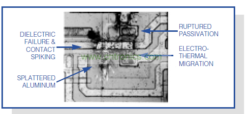 圖1中的顯微圖片表明競爭對手的RS-232接口芯片在受到15kV(一般測試水平)的ESD衝擊後的損壞情況,強大的壓力使芯片內的金屬汽化,結果造成明顯的大麵積損壞。其它情況下,考察柵氧化層或