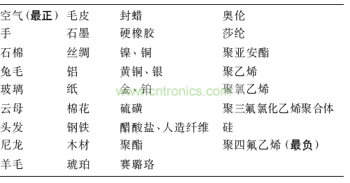 表1列出了不同材料摩擦起電的電荷特性,如玻璃、尼龍帶t1:電,矽、聚ju四si氟fu乙yi烯xi帶dai負fu電dian。材cai料liao的de導dao電dian性xing也ye對dui材cai料liao表biao麵mian建jian立li電dian荷he的de能neng力li有you影ying響xiang,許xu多duo材cai料liao的de導dao電dian性xing或huo表biao麵mian電dian阻zu很hen大da程cheng度du上shang取qu決jue於yu濕shi度du,濕shi度du越yue低di導dao電dian能neng力li越yue低di,越yue容rong易yi阻zu止zhi電dian荷he的de遷qian移yi使shi其qi停ting