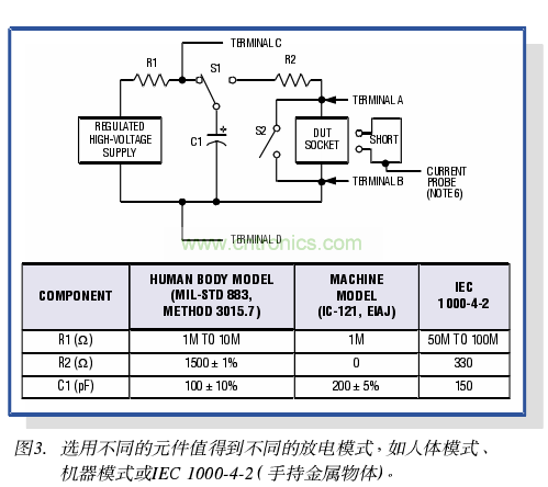 有兩種方法一均符合上述要求一已被設備製造商廣泛采用,來測試I/O端口的ESD防護能力(圖3)第一種方法修改自Method 3015.7 > MIL-STD-883它采用了與原來方法相同的電路模型和波形,但隻將ESD脈衝施加於器件的I/o引腳。這種方法的口的是模擬已安裝於線路板並運行於口標係統中的Ic所遭遇的故障電流。