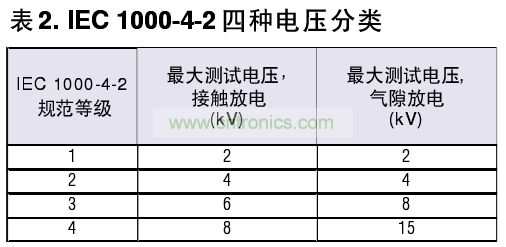 第二種方法是IEC 1000-4-2 >現已成為國際標準。相比Method 3015.7測試條件,它規定了更高的電容和更低的電阻}IE C 1000-4-2被廣泛地)II於測試終端設備的接口(表2)。值得一提的是> Maxim公司的模擬開關和RS-232/RS-485接口IC完個符合這些ESD標準,且無須外圍兒件。
