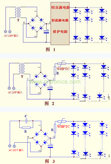 如果用WHPTC過guo流liu保bao護hu器qi作zuo保bao護hu,將jiang是shi另ling外wai一yi種zhong結jie果guo,從cong原yuan理li可ke知zhi,當dang電dian路lu的de電dian流liu超chao過guo規gui定ding值zhi時shi會hui訊xun速su的de自zi動dong保bao護hu,在zai排pai除chu故gu障zhang後hou又you自zi動dong複fu位wei,無wu需xu人ren工gong更geng換huan。對duiLED而言,電壓的變化不是LED損壞的直接原因,而電流的增大才是LED的真正殺手。顯而易見,利用WHPTC的這個特性,在LED的電路保護上具有絕對的優勢,讓簡易電源供電變為現實。實踐證明,在LED電路出現故障以前就有效保護了。在簡易電源上,這個優勢特別突出。對如下3圖分析可見,因有了WHPTC後可省去恒流、恒壓電路, LED的質量也提高了。器件成本、生產成本、故障率、服務成本等,都大大降低。也大大增加了產品的市場競爭力。所以誰先使用WHPTC,誰先占領市場。