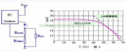 圖3所示為上一電路改良型:此電路借由PTC熱敏電阻,生成隨溫度變化的LED電流。通過正確選擇PTC熱敏電阻、Rseries以及Rparallel,此電路與專用驅動IC和LED組合相匹配。其中,LED電流可經由下列方程式計算得出: