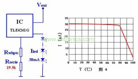 圖3所示電路闡明了LED電流(參見圖3)的溫度依賴性。與針對最高運行溫度為60度的恒流源相比較,使用PTC熱敏電阻後LED電流可在0度和40度之間提升達40%,並且LED亮度也能提高同等百分比。