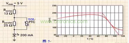 由於LED電流的絕大部分流經PTC熱敏電阻本身,因此需要選擇一個較大的徑向引線式元件。PTC將因為流經電阻本身的電流而導致發熱,因此會一直減少電流,無論環境溫度為何(如圖5所示)。並聯兩個或更多片式PTC熱敏電阻會將電流分流,但此方案仍存在局限性。