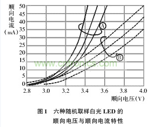 圖1是從A、B兩家LED企業的產品中隨機取三種白光LED樣品進行順向電壓與順向電流特性檢測的結果。根據檢測結果顯示,若利用3.4V順向電壓驅動上述六種白光LED時,順向電流會在10~44mA範圍內大幅變動。表1為白光LED的電氣與光學特性。