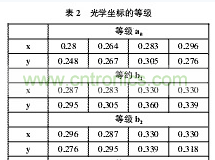 表2為光學坐標的等級(rank)(IF=25mA,Ta=250C)。