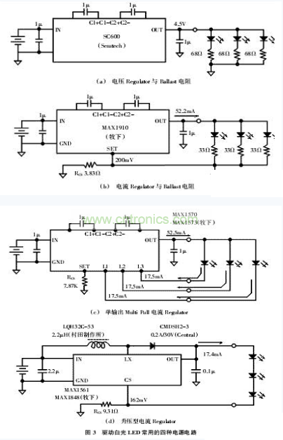 圖3(a)的電路分別使用可以控製LED電流的電壓ReguLator與BaLLast電阻,這種電路的優點是電壓ReguLator種類豐富,設計者可以選擇的自由度較大,而且與電壓ReguLator、LED的接點隻有一點;缺點是BaLLast造成的電力損失會導致效率惡化。此外,LED的順向電流也無法獲得精密控製。