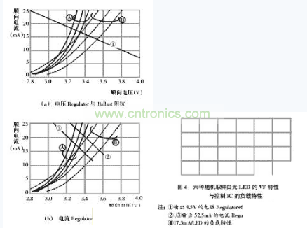 圖3是驅動白光LED常用的四種電源電路;圖4是上述六種隨機取樣白光LED穩定後的ReguLation精度特性。