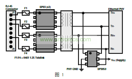 任何線路端保護裝置(這個例子中的 SP03A)不能有 GND引腳(2、3、6 和 7)連接到 GND,以保證符合 IEEE802.3隔離標準;因此,設計師沒有選擇,隻能將此設備作為“異模”保護器。(注:當然,這使得驅動端保護元件成為必要,以保護係統免受共模事件損壞。)