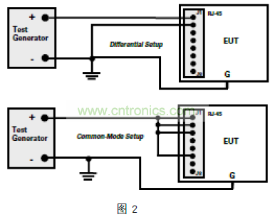 檢查設備的 EFT 免疫力(根據 IEC61000-4-4 標準),與共模雷擊浪湧測試非常相似。在如圖 3 所示比較典型的配置中,所有的導體(或引腳)電容耦合到測試信號發生器的正極和“浪湧”到 GND。如果數據線幾乎沒有差別,線對之間很少有異模能量,但變壓器耦合電容會再次將共模能量以衰減的方式傳輸到驅動端。