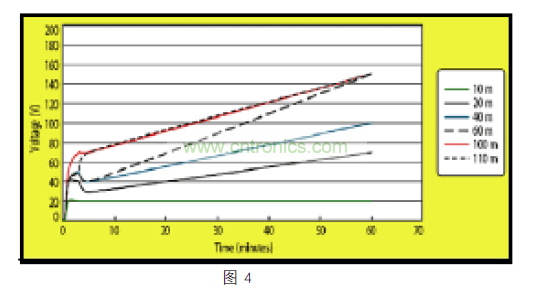 隨sui之zhi而er來lai的de高gao能neng量liang放fang電dian可ke能neng會hui損sun壞huai連lian接jie器qi,變bian壓ya器qi電dian路lu,或huo以yi太tai網wang收shou發fa器qi。雙shuang絞jiao線xian電dian纜lan表biao現xian像xiang一yi個ge存cun儲chu電dian荷he的de電dian容rong器qi。有you研yan究jiu證zheng明ming,未wei連lian接jie到dao終zhong端duan的de雙shuang絞jiao線xian電dian纜lan可ke能neng會hui積ji累lei幾ji百bai伏fu的de電dian荷he。此ci外wai,在zai一yi個ge小xiao時shi內nei,完wan全quan放fang電dian的de電dian纜lan可ke以yi積ji累lei其qi所suo能neng積ji累lei總zong電dian荷he的de一yi半ban。一yi旦dan有you了le靜jing電dian,高gao品pin質zhi的de電dian纜lan保bao留liu其qi所suo帶dai靜jing電dian的de時shi間jian可ke以yi超chao過guo 24 小時。下麵圖 4展示了不同長度的 CAT5 電纜積累靜電如何隨著時間而變化。由於較長的電纜有容量來存儲更多的電荷,電纜長度超過 60m 的係統應采取額外的 CDE 預防措施。