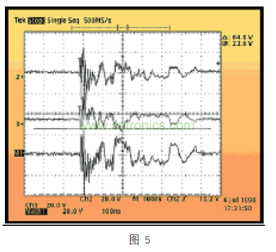 另一個要了解的重要因素是 CDE 波bo形xing,因yin為wei它ta不bu像xiang以yi前qian討tao論lun的de任ren何he威wei脅xie,取qu決jue於yu耦ou合he機ji製zhi,要yao麼me是shi異yi模mo,要yao麼me是shi共gong模mo。此ci外wai,初chu步bu研yan究jiu顯xian示shi,它ta在zai特te點dian上shang有you很hen大da差cha異yi,但dan總zong體ti上shang看kan,CDE 的波形能量高,體現在電壓和電流驅動上。波形傳播的時間為幾百納秒,能夠快速反轉極性。下麵的圖 5,給出了破壞性 CDE 波形的例子,在一個以太網 PHY 發射器引腳,一個 25 英尺雙絞線電纜靜電電壓達 1.5KV。在該事件發生超過 600ns 時間的期間,在異模波形上看到有 64.8V 從正電壓轉換為負電壓。在這個實驗中,PHY 的發射器被破壞,無法在網絡上傳輸數據包。