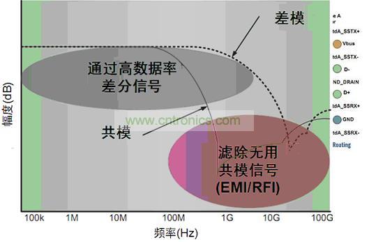 這些應用中能使用共模濾波器(CMF)來消除不想要的共模噪聲,並防止高速信號輻射有害的共模噪聲信號至係統其它元件。同時,CMF還使想要的高速數據事實上不受影響地通過。典型的CMF特性如圖4所示,圖中顯示消除了共模噪聲,同時支持差模信號無損通過。