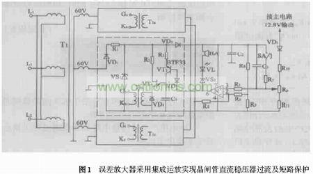 將晶體管誤差放大器更換為運算放大器式的誤差放大器,電路結構將簡化,且放大倍數方便可調,容易製成比例積分微分調節器(PID) ,使調壓係統的動態特性更趨完美合理。VD2 管將C2 的平滑直流電壓與移相觸發器上的同步梯形波電壓隔離開來。當來自主電路的+ 12. 8V 輸出電壓發生變化時,取樣電位器RP 上的電壓也成比例變化,從而使運放N 的同相輸入端3 腳電壓相應變化,輸出端6 腳電壓按放大倍數變化,最終導致晶閘管輸出電壓產生相反方向的變化,平衡主電路輸出端的變化,保持了輸出電壓的穩定。
