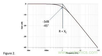 R/C電路產生了極點。阻值和抗值相等時的頻率為“拐點”或稱截至頻率。這點的響應是-3dB(0.707V)的衰減,和45°的相位滯後。如圖所示:不需要數學計算,波特圖如下: