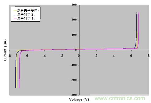 為了進行公平的比較,所選元器件應當有相似的封裝尺寸和參數指標。用來比較的是三 隻ESD保護二極管,當對它們的電特性進行比較時,認為這些器件可以彼此互換。這些器件都是雙向的ESD保護器件,具有同樣的擊穿電壓(6.8 V)、電容(15 pf)和封裝外形(1.0 × 0.6 × 0.4 mm)。這裏所選擇的產品分別是競爭對手1的RSB6.8CS、競爭對手2的PG05DBTFC和安森美半導體的ESD9B5.0ST5G。