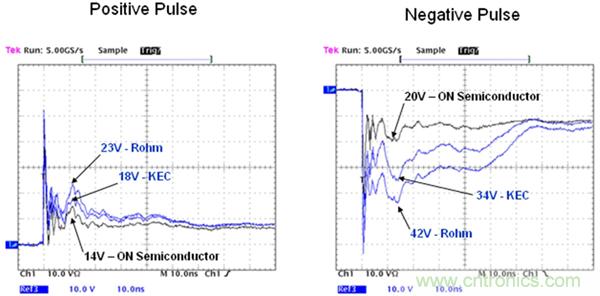 從圖3所示的屏幕圖上可見,顯然,與兩個競爭對手的器件(藍色波形)相比較,安森美半導體保護解決方案(黑色波形)提供更低的ESD脈衝鉗位電壓。與競爭對 手2的18 V和競爭對手1的23 V相比較,安森美半導體的器件將正脈衝鉗位在14 V。而在負脈衝期間,這三個器件之間鉗位電壓的差異更加明顯。安森美半導體、競爭對手2和競爭對手1的器件對負脈衝的鉗位電壓分別是20 V、34 V和42 V。在負ESD脈衝期間這三種器件之間有明顯的區別,競爭對手2的器件的鉗位電壓比安森美半導體的器件高70%,而競爭對手1的器件的鉗位電壓則是安森美 半導體器件的兩倍之多。通過競爭對手的保護器件後的剩餘負脈衝電壓對那些更容易受到ESD破壞的新IC設計有潛在的危險。然而,安森美半導體的器件卻能在 負脈衝和正脈衝兩個方向上保持低的鉗位電壓,從而將遭受正/負ESD脈衝的破壞風險都保持在最低水平。