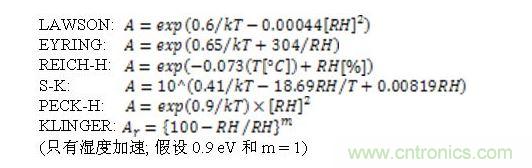 檢索現有文獻,Peck是提到的另一個作者。他改變了Lawson建議值,發現使用相對濕度能夠適應他自己的測試結果。在一篇文章裏,Hallberg很好地概括了所有濕度測試和加速模型,包括他自己的。過去30年,他與Peck對濕度加速進行了大量研究。在很多出版物裏都提到,他們的研究成果的適應性最好。圖8是Hallberg收(shou)集(ji)的(de)可(ke)用(yong)模(mo)型(xing)。除(chu)了(le)溫(wen)度(du)意(yi)外(wai),他(ta)們(men)都(dou)使(shi)用(yong)相(xiang)對(dui)濕(shi)度(du)做(zuo)為(wei)主(zhu)要(yao)的(de)測(ce)量(liang)參(can)數(shu)。檢(jian)索(suo)最(zui)近(jin)幾(ji)年(nian)有(you)關(guan)濕(shi)度(du)加(jia)速(su)的(de)出(chu)版(ban)物(wu),我(wo)們(men)發(fa)現(xian),人(ren)們(men)還(hai)在(zai)使(shi)用(yong)與(yu)Hallberg和Peck 描述或收集的模型相同的或可比較的模型。