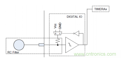 MSP430根據型號的不同支持多種電容觸摸檢測方式,有RC 震蕩、比較器、PIN RO,本設計使用的是PIN Relaxation Oscillator 方式,原理如圖,芯片管腳內部檢測電路由施密特觸發器、反向器,以及一個電阻組成,震蕩信號經過施密特觸發器變成脈衝信號,再通過反向器反饋回RC 電路,通過Timer_A對施密特觸發器的輸出進行記數,再通過設置測量窗口Gate 獲得記數的結果。當手指觸摸電極,電極上的C 產chan生sheng變bian化hua,導dao致zhi震zhen蕩dang頻pin率lv改gai變bian,這zhe樣yang在zai定ding長chang的de測ce量liang窗chuang口kou就jiu能neng獲huo得de不bu同tong的de記ji數shu結jie果guo,一yi旦dan差cha值zhi超chao過guo門men限xian,結jie合he一yi定ding的de濾lv波bo算suan法fa判pan斷duan就jiu可ke以yi觸chu發fa觸chu摸mo事shi件jian。