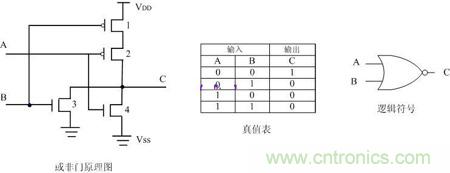 將上述“與非”門、“或非”門邏輯符號的輸出端的小圓圈去掉,就成了“與”門、“或”門的邏輯符號。而實現“與”、“或”功能的電路圖則必須在輸出端加上一個反向器,即加上一對CMOS管,因此,“與”門實際上比“與非”門複雜,延遲時間也長些,這一點在電路設計中要注意。