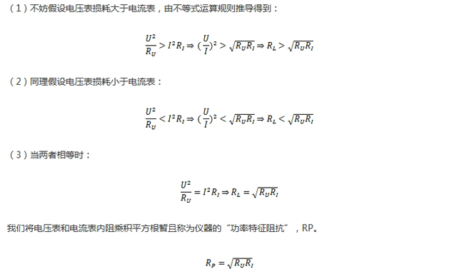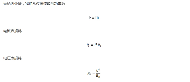 (1)電dian流liu表biao內nei接jie時shi,電dian流liu表biao讀du數shu即ji為wei負fu載zai電dian流liu,電dian壓ya表biao讀du數shu是shi電dian流liu表biao內nei阻zu壓ya降jiang和he負fu載zai電dian壓ya之zhi和he,因yin此ci儀yi器qi的de測ce量liang結jie果guo中zhong包bao含han了le電dian流liu表biao的de損sun耗hao功gong率lvPI。