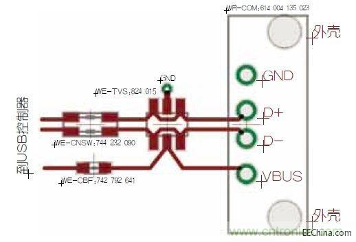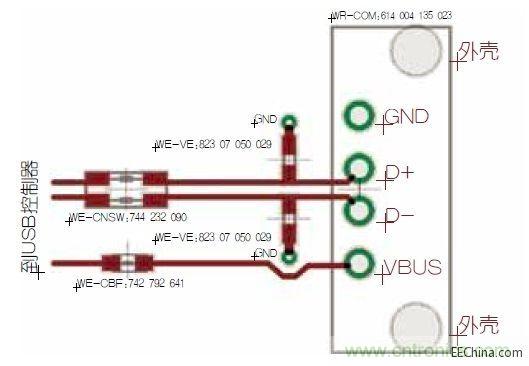 從圖3可以明顯看出,有兩條差分信號線(D+和D-)從插頭連接器連接到TVS二極管,再通過電流補償式數據線扼流圈連接到USB控製器。這樣能夠得到出色的靜電放電保護功能,並能良好的抑製數據線對。VBUS通過TVS二極管路由到貼片磁珠。在貼片磁珠之後,可以插入額外的電容和另一個貼片磁珠來實現最大可能的PI濾波器衰減。