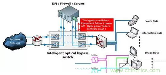 OBP旁路保護係統: 光旁路保護係統(Optical Bypass Protection system)是shi一yi種zhong應ying用yong於yu光guang纖xian通tong信xin領ling域yu並bing能neng自zi動dong繞rao過guo故gu障zhang網wang絡luo節jie點dian的de智zhi能neng光guang路lu切qie換huan係xi統tong,能neng自zi動dong識shi別bie網wang絡luo節jie點dian供gong電dian狀zhuang態tai及ji光guang信xin號hao輸shu出chu狀zhuang態tai,當dang本ben地di光guang設she備bei出chu現xian故gu障zhang(包括電源中斷、硬件或軟件故障等)後,能夠瞬間切換到旁通光路,通訊線路將繞過本地設備(即故障節點),從而能避免由於該故障節點而發生全阻障礙,保證係統連通正常。