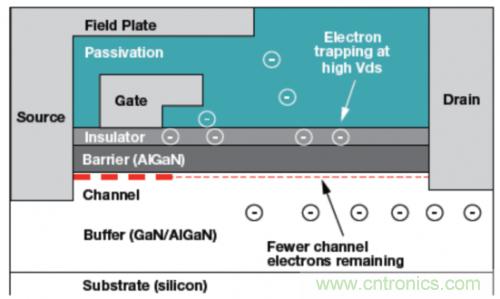 圖1:一個GaN器件的電路橫截麵顯示被陷獲的電子如何通過減少通道層中的電子數量來增加Rds導通電阻。