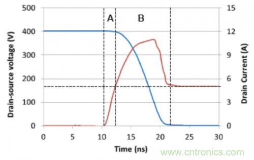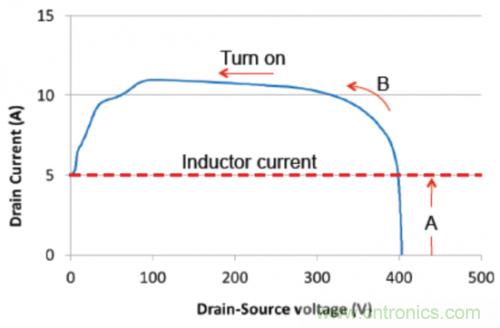 器件應力由使用圖2中所示拓撲的升壓轉換器顯示。圖3中顯示的是初級側開關 (FET1) 上硬開關接通變換的仿真結果。輸入電壓為200V,而電感器電流為5A(負載電流大約為2.5A)。在這個情況下,當FET1關閉時,由於鉗製FET (FET2) 導電,它的漏電壓大約鉗製在400V。因此,當FET1接通時,它需要在Vds開始下降之前灌入整個電感器電流(區域A)。