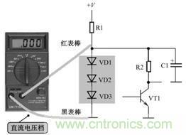 檢測這一電路中的3隻二極管最為有效的方法是測量二極管上的直流電壓,如圖所示是測量時接線示意圖。如果測量直流電壓結果是1.8V左右,說明3隻二極管工作正常;如果測量直流電壓結果是0V,要測量直流工作電壓+V是否正常和電阻R1是否開路,與3隻二極管無關,因為3隻二極管同時擊穿的可能性較小;如果測量直流電壓結果大於1.8V,檢查3隻二極管中有一隻開路故障。