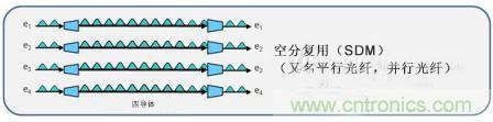 空(kong)分(fen)複(fu)用(yong),通(tong)常(chang)被(bei)稱(cheng)為(wei)並(bing)行(xing)光(guang)纖(xian),是(shi)一(yi)種(zhong)通(tong)過(guo)在(zai)複(fu)合(he)鏈(lian)路(lu)中(zhong)增(zeng)加(jia)一(yi)條(tiao)或(huo)多(duo)條(tiao)光(guang)纖(xian)來(lai)增(zeng)加(jia)一(yi)個(ge)或(huo)多(duo)個(ge)通(tong)道(dao)的(de)方(fang)式(shi)。在(zai)這(zhe)種(zhong)情(qing)況(kuang)下(xia),一(yi)個(ge)通(tong)道(dao)實(shi)際(ji)上(shang)就(jiu)是(shi)另(ling)一(yi)股(gu)光(guang)纖(xian)。這(zhe)是(shi)上(shang)述(shu)時(shi)分(fen)複(fu)用(yong)通(tong)道(dao)的(de)一(yi)個(ge)替(ti)代(dai)方(fang)案(an),在(zai)時(shi)分(fen)複(fu)用(yong)中(zhong),信(xin)號(hao)以(yi)按(an)時(shi)間(jian)合(he)並(bing)在(zai)同(tong)一(yi)條(tiao)光(guang)纖(xian)上(shang)。行(xing)業(ye)中(zhong)有(you)很(hen)多(duo)應(ying)用(yong)這(zhe)種(zhong)技(ji)術(shu)的(de)例(li)子(zi)。例(li)如(ru),40G SR4通過使用四通道或光纖,在多模光纖上提供40Gbps的速率。也就是在每個方向上有四個通道。這也正是“SR4”中4的含義,4個通道,每個10Gbps。