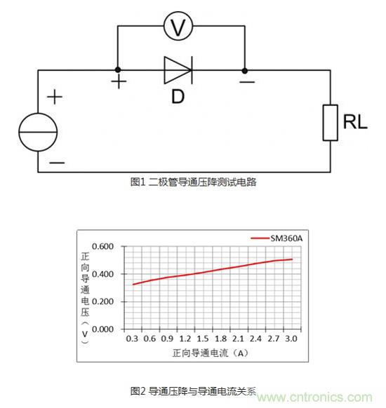 在二極管兩端加正向偏置電壓時,其內部電場區域變窄,可以有較大的正向擴散電流通過PN結。隻有當正向電壓達到某一數值(這一數值稱為“門檻電壓”,鍺管約為0.2V,矽管約為0.6V)以後,二極管才能真正導通。但二極管的導通壓降是恒定不變的嗎?它與正向擴散電流又存在什麼樣的關係?通過下圖1的測試電路在常溫下對型號為SM360A的二極管進行導通電流與導通壓降的關係測試,可得到如圖2所示的曲線關係:正向導通壓降與導通電流成正比,其浮動壓差為0.2V。從輕載導通電流到額定導通電流的壓差雖僅為0.2V,但對於功率二極管來說它不僅影響效率也影響二極管的溫升,所以在價格條件允許下,盡量選擇導通壓降小、額定工作電流較實際電流高一倍的二極管。
