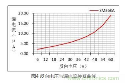 在二極管兩端加反向電壓時,其內部電場區域變寬,有較少的漂移電流通過PN結(jie),形(xing)成(cheng)我(wo)們(men)所(suo)說(shuo)的(de)漏(lou)電(dian)流(liu)。漏(lou)電(dian)流(liu)也(ye)是(shi)評(ping)估(gu)二(er)極(ji)管(guan)性(xing)能(neng)的(de)重(zhong)要(yao)參(can)數(shu),二(er)極(ji)管(guan)漏(lou)電(dian)流(liu)過(guo)大(da)不(bu)僅(jin)使(shi)其(qi)自(zi)身(shen)溫(wen)升(sheng)高(gao),對(dui)於(yu)功(gong)率(lv)電(dian)路(lu)來(lai)說(shuo)也(ye)會(hui)影(ying)響(xiang)其(qi)效(xiao)率(lv),不(bu)同(tong)反(fan)向(xiang)電(dian)壓(ya)下(xia)的(de)漏(lou)電(dian)流(liu)是(shi)不(bu)同(tong)的(de),關(guan)係(xi)如(ru)圖(tu)4所示:反向電壓愈大,漏電流越大,在常溫下肖特基管的漏電流可忽略。