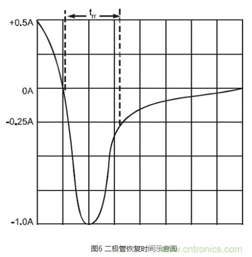 如圖6所(suo)示(shi),二(er)極(ji)管(guan)的(de)反(fan)向(xiang)恢(hui)複(fu)時(shi)間(jian)為(wei)電(dian)流(liu)通(tong)過(guo)零(ling)點(dian)由(you)正(zheng)向(xiang)轉(zhuan)換(huan)成(cheng)反(fan)向(xiang),再(zai)由(you)反(fan)向(xiang)轉(zhuan)換(huan)到(dao)規(gui)定(ding)低(di)值(zhi)的(de)時(shi)間(jian)間(jian)隔(ge),實(shi)際(ji)上(shang)是(shi)釋(shi)放(fang)二(er)極(ji)管(guan)在(zai)正(zheng)向(xiang)導(dao)通(tong)期(qi)間(jian)向(xiang)PN結jie的de擴kuo散san電dian容rong中zhong儲chu存cun的de電dian荷he。反fan向xiang恢hui複fu時shi間jian決jue定ding了le二er極ji管guan能neng在zai多duo高gao頻pin率lv的de連lian續xu脈mai衝chong下xia做zuo開kai關guan使shi用yong,如ru果guo反fan向xiang脈mai衝chong的de持chi續xu時shi間jian比bi反fan向xiang恢hui複fu時shi間jian短duan,則ze二er極ji管guan在zai正zheng向xiang、反向均可導通就起不到開關的作用。PNjiezhongchucundedianheliangyufanxiangdianyagongtongjuedinglefanxianghuifushijian,erzaigaopinmaichongxiabudanhuishiqisunhaojiazhong,yehuiyinqijiaodadedianciganrao。suoyizhidaoerjiguandefanxianghuifushijianzhengquexuanzeerjiguanhehelishejidianlushibiyaode,xuanzeerjiguanshiyingjinliangxuanzePN結電容小、反向恢複時間短的,但大多數廠家都不提供該參數數據。