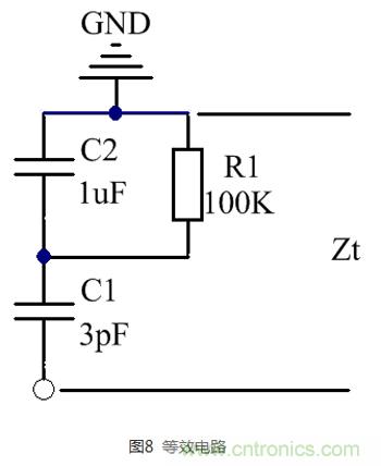 不管正向還是反向接入法,其等效電路都如圖8所示。我們假設二極管的節電容為3pF,附件功能模塊寄生總電容1uF。如果電阻足夠大,那麼可以忽略,此時就是兩個電容串聯,和電阻並聯類似,CT=C1*C2/(C1+C2)≈C1(C2較大)。大電容就算變化很大,串聯總電容幾乎等於小電容,即3pF,有效減小接入電容。