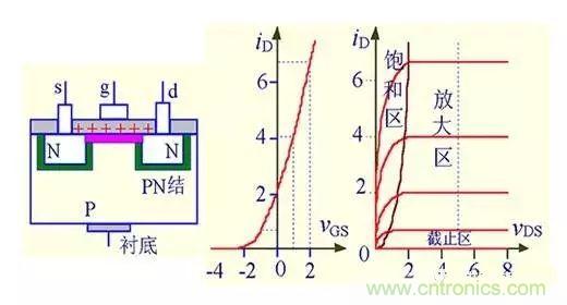 (1)N溝道耗盡型:製造時在柵極絕緣層中摻有大量的正離子,所以即使在VGS=0時,由於正離子的作用,兩個N區之間存在導電溝道(類似結型場效應管)。