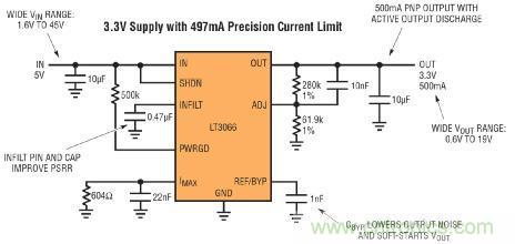 3.3V Supply with 497mA Precision Current Limit:具 497mA 精準電流限製的 3.3V 電源